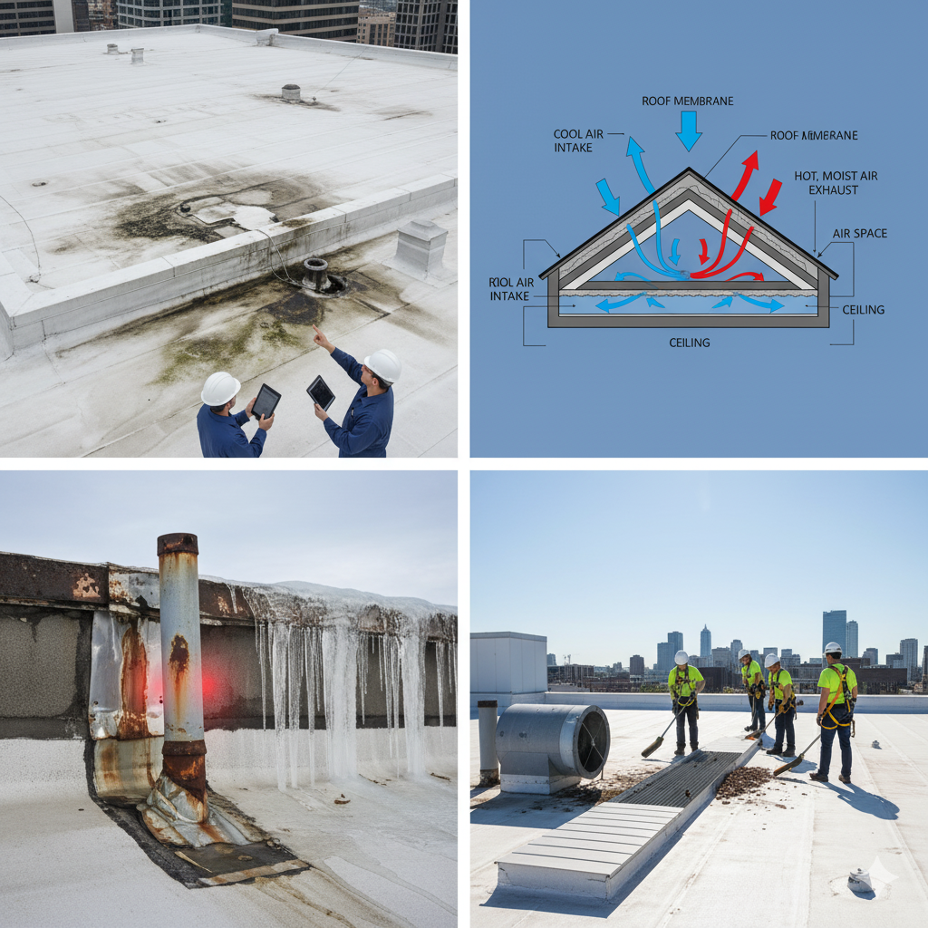 The roof’s size, occupancy type, and local climate conditions also influence ventilation requirements. Buildings with high moisture-generating activities (like restaurants or manufacturing facilities) need more robust ventilation than dry storage facilities. Regional climate differences across the country also significantly impact ventilation needs, with humid southeastern states like Atlanta requiring different approaches than arid western regions or cold northern areas.
